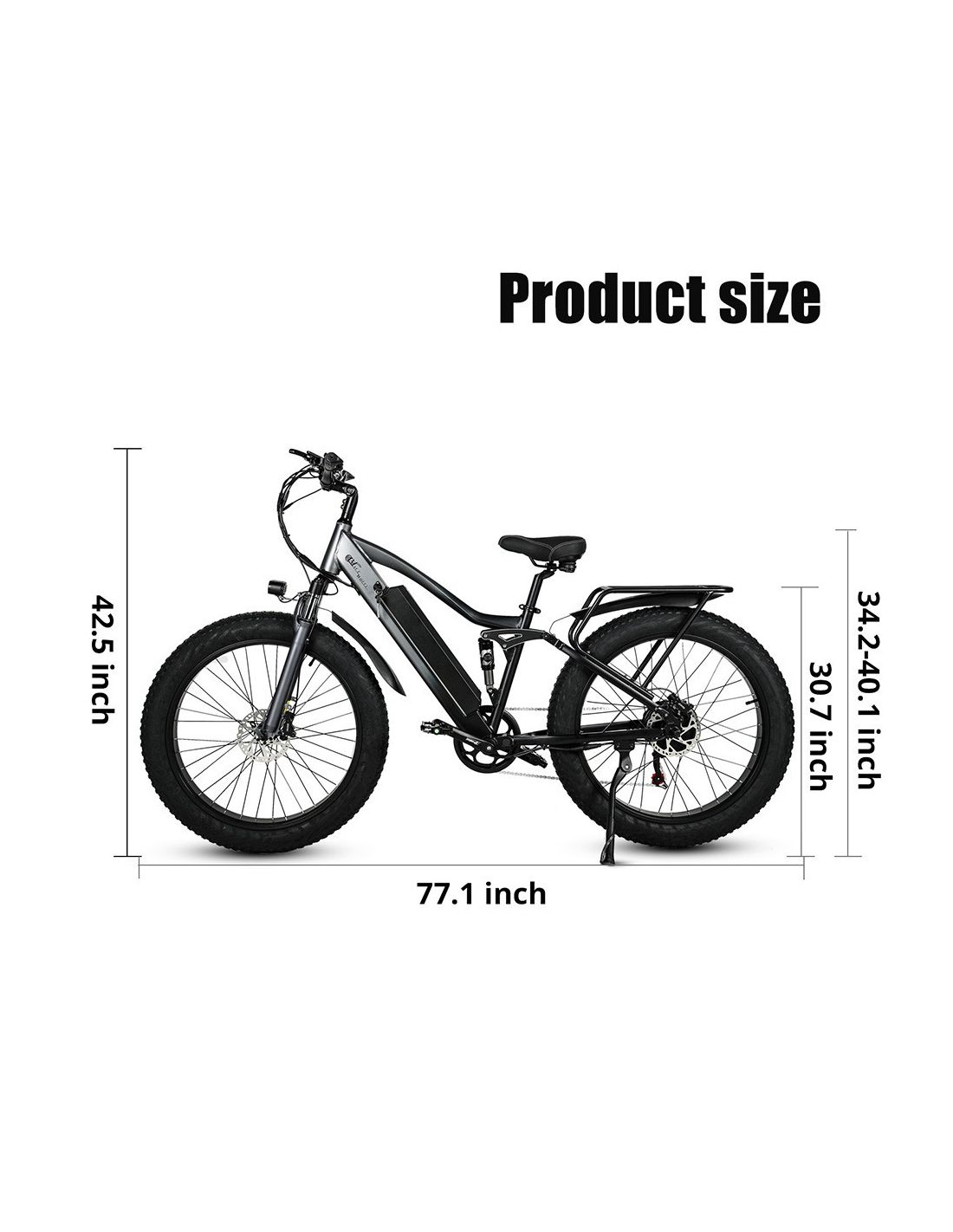Batterie: 17AH Tension du chargeur : 100-240 V 2 A. Puissance du moteur : 750 W Engrenages: cinq vitesses Pneu: CST 26*4.0 pouces Frein: Frein à disque Gradeability: 30 ° Vitesse maximale : 40-45 km/h Kilométrage de Pure Electric: 40-60KM Kilométrage d'assistance : 70-110 KM |